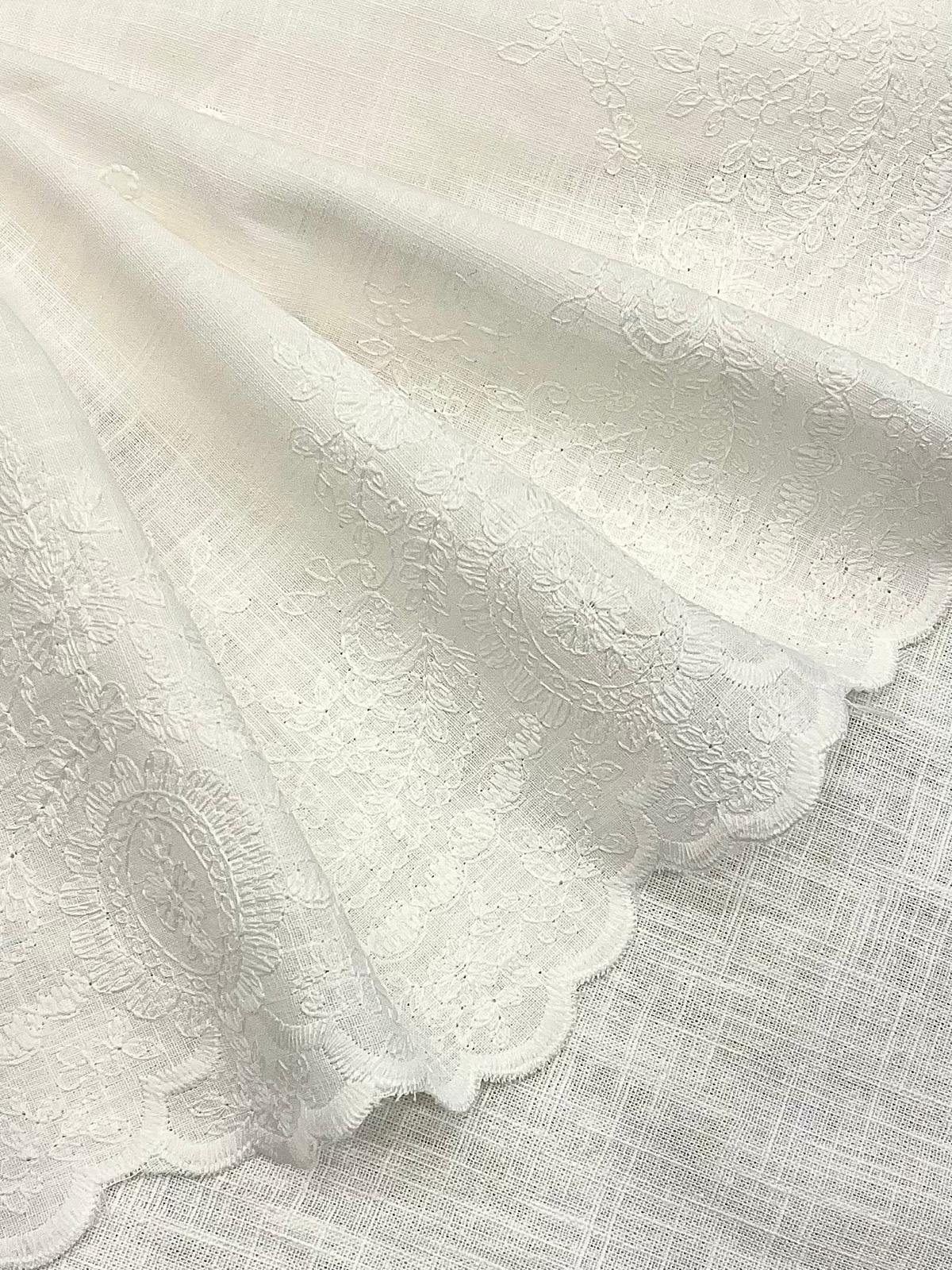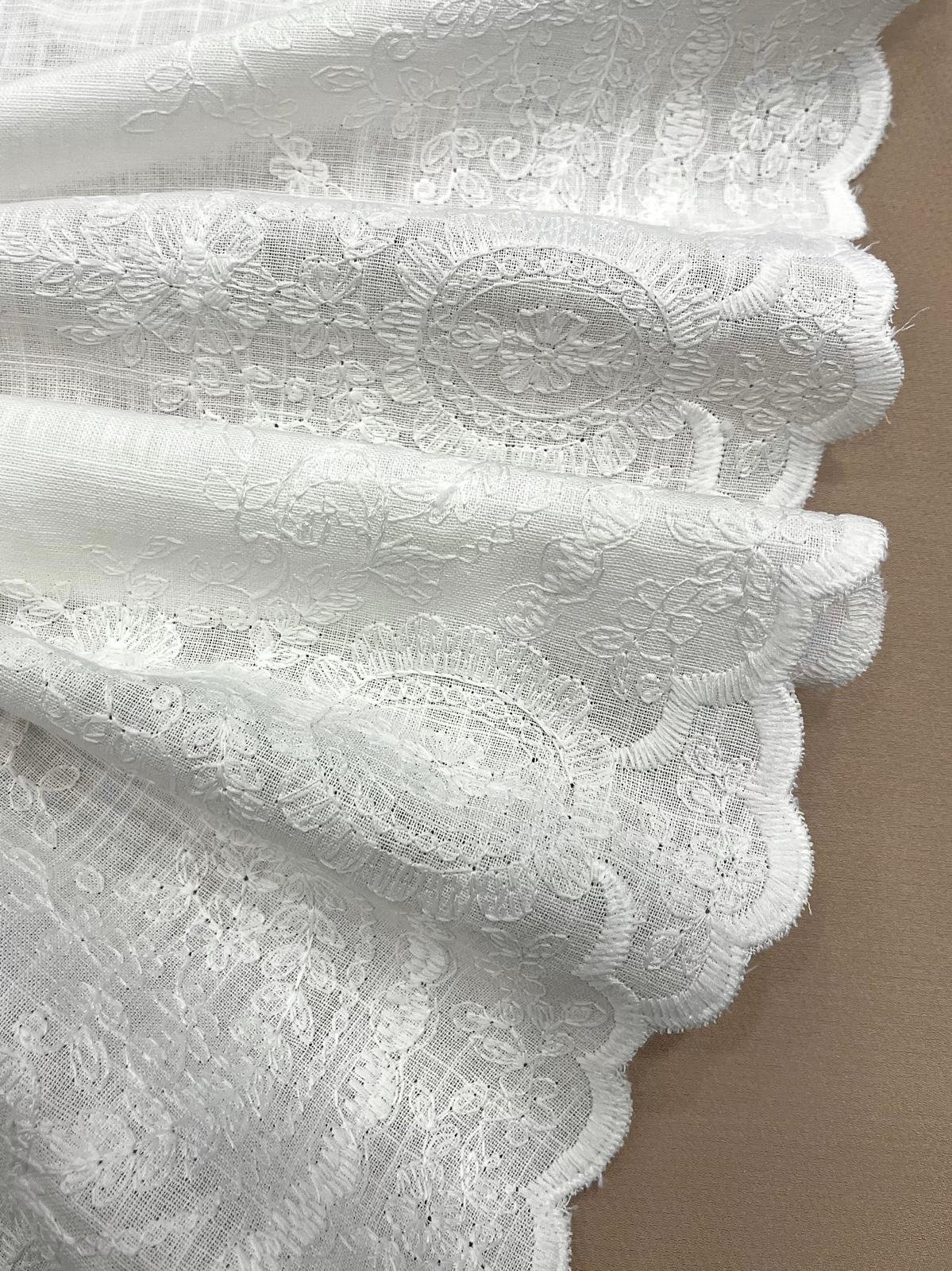Hilo bordado de plumeti en tono blanco natural con blonda de medallones bordadas efecto espejo en ambos orillas del tejido.
