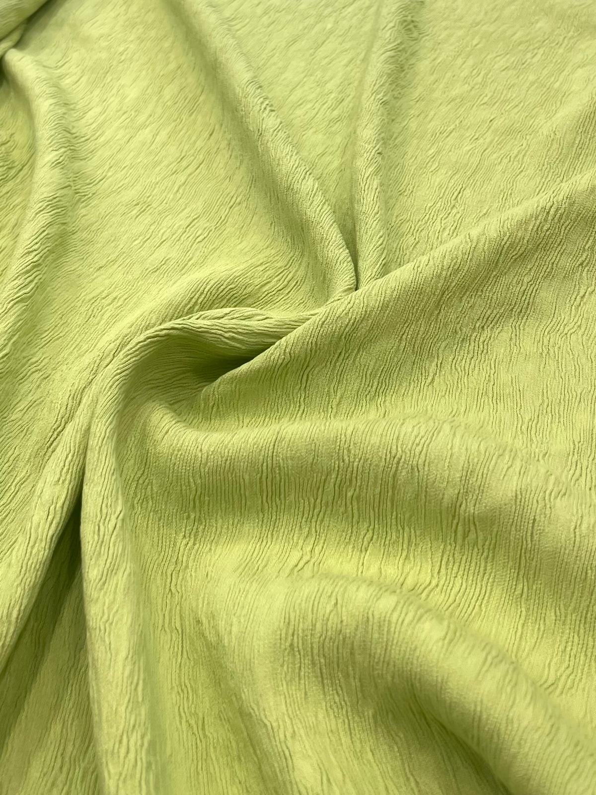Crep mate por ambas caras microplisado en tono verde manzana . Este tejido destaca por su rugosidad, peso y caída, ofreciendo una textura ligeramente elástica que proporciona una sensación de confort.