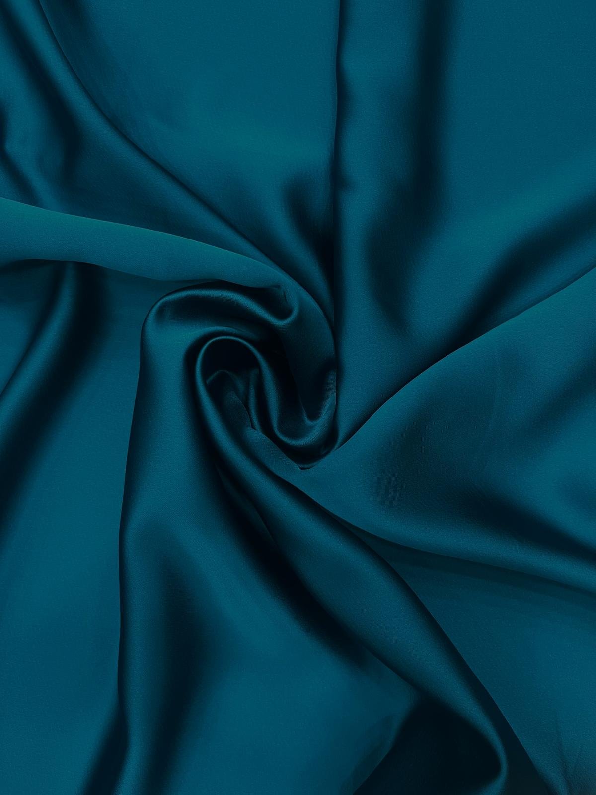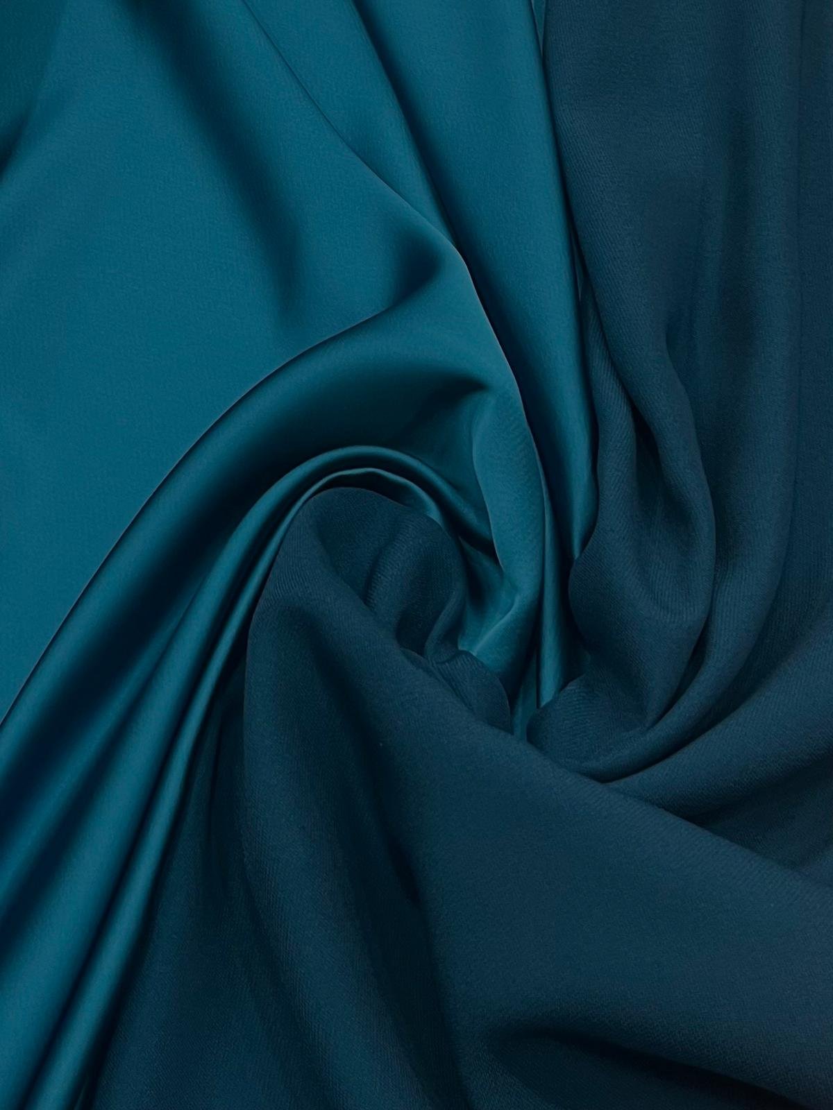 Crep satén en tono azul petróleo, un tejido con caída, peso y cuerpo. Se puede trabajar por ambas caras.