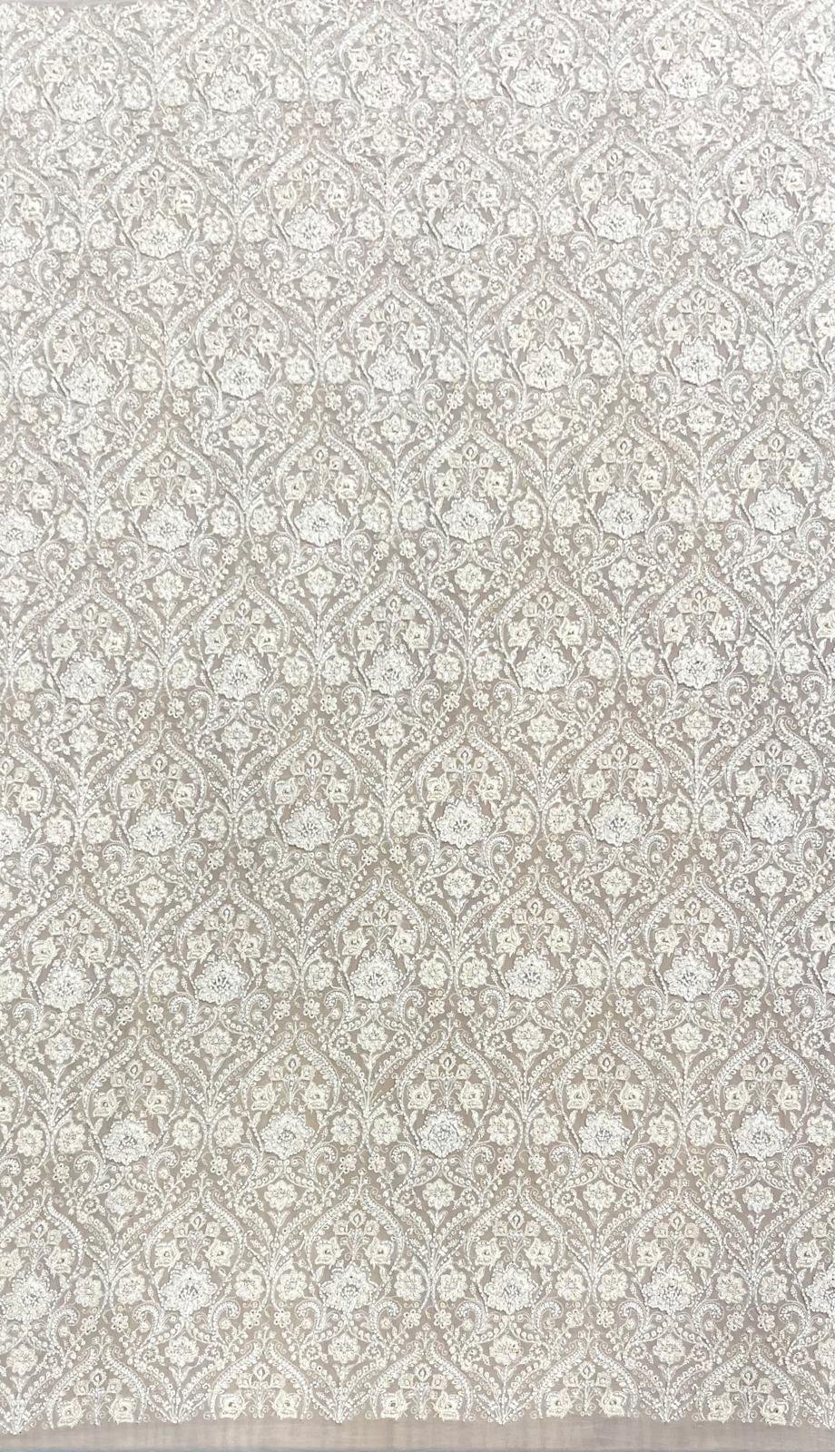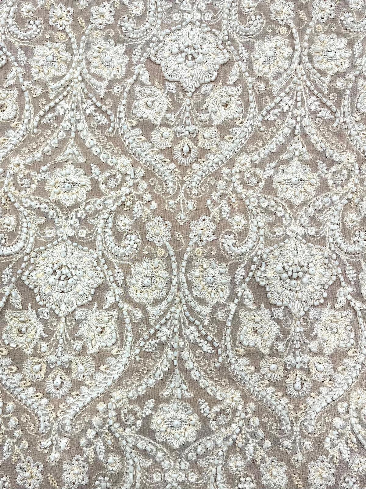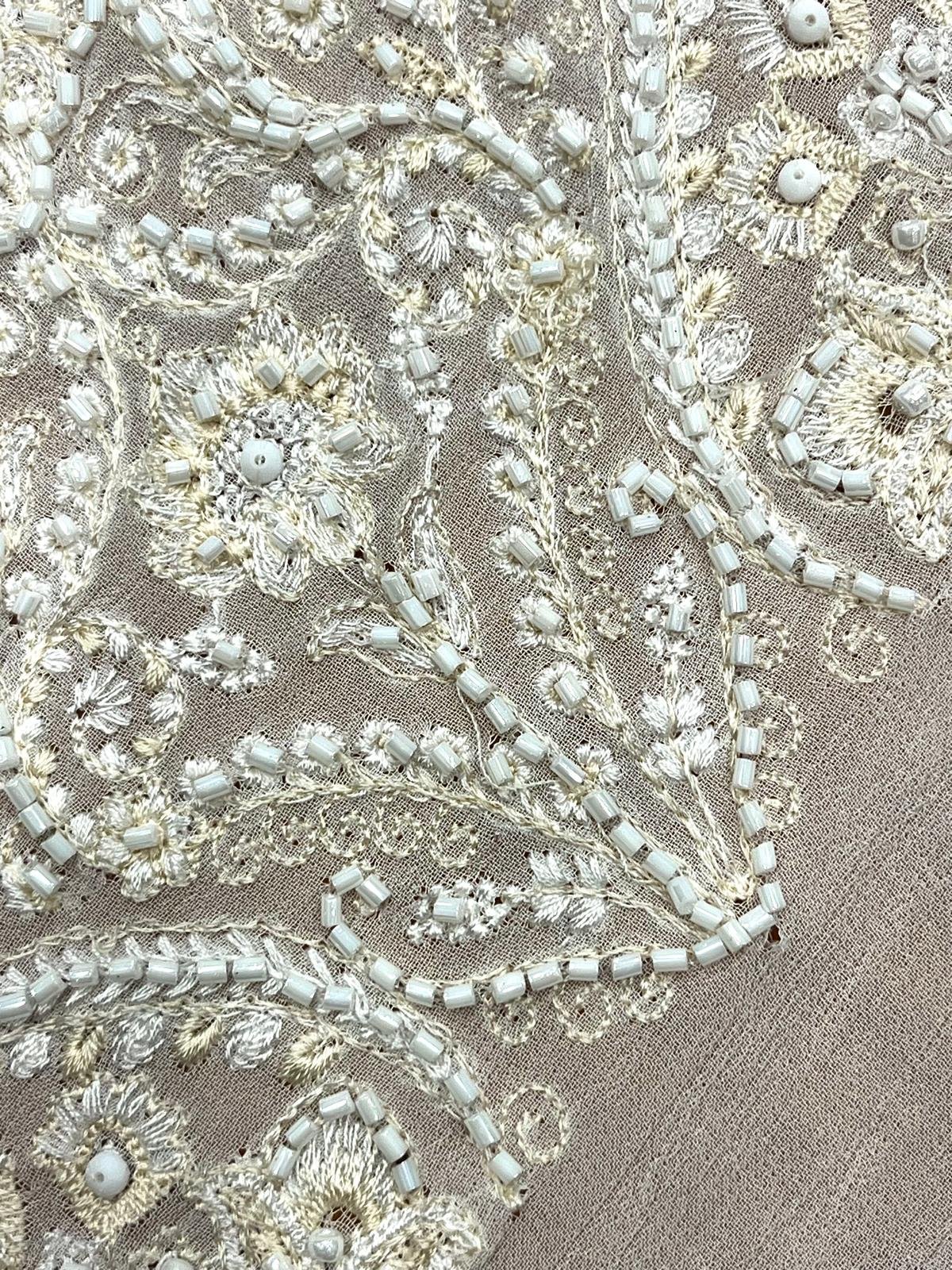 Gasa de seda natural bordada combinando hilos blanco natural y marfil con pedrería. Tejido natural bordado a mano.