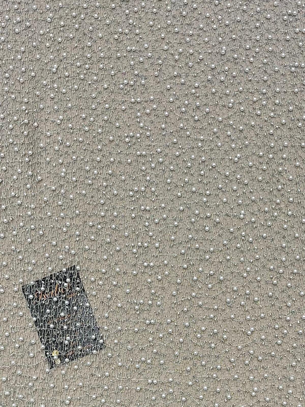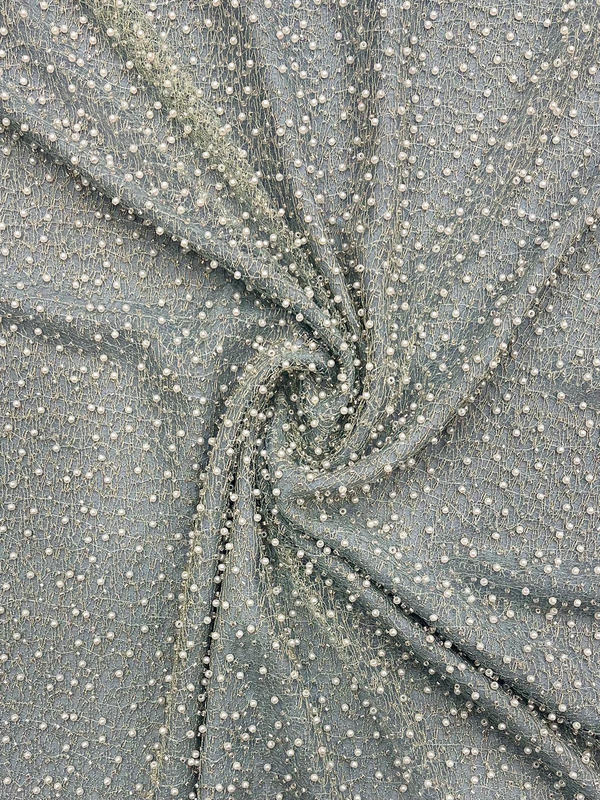 Malla en tono verde jabonoso con lurex dorado con perlitas en tono blanco natural.