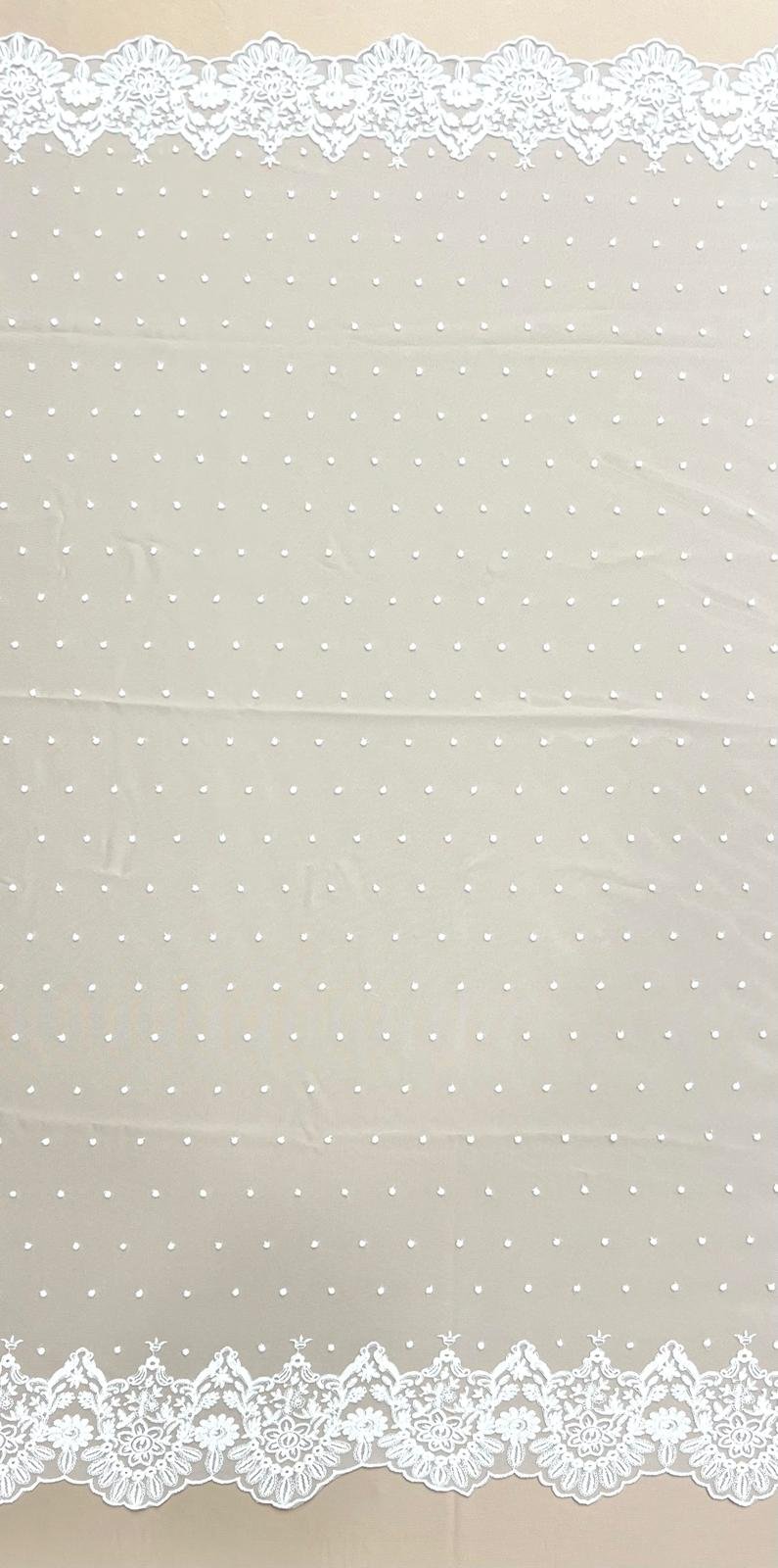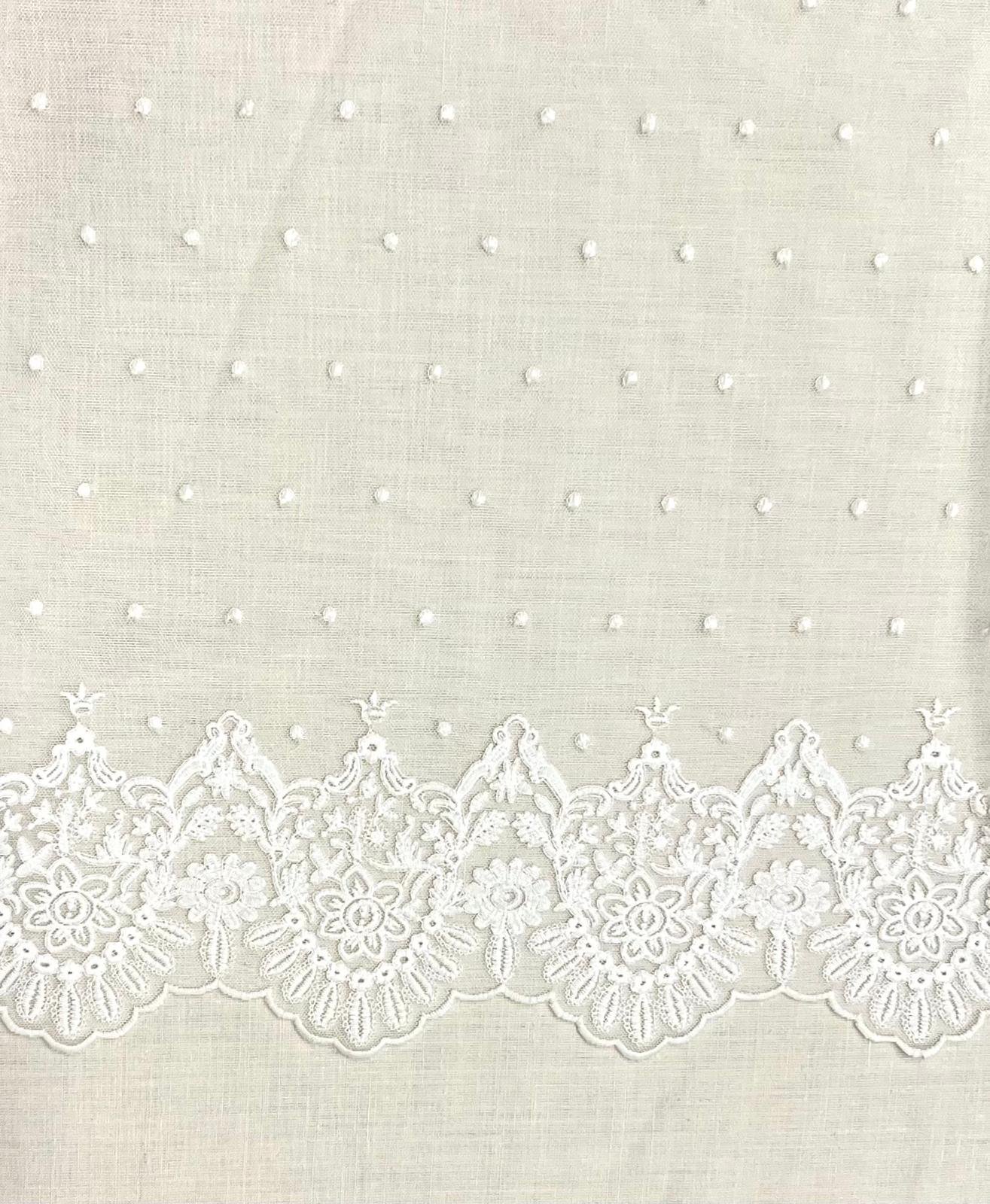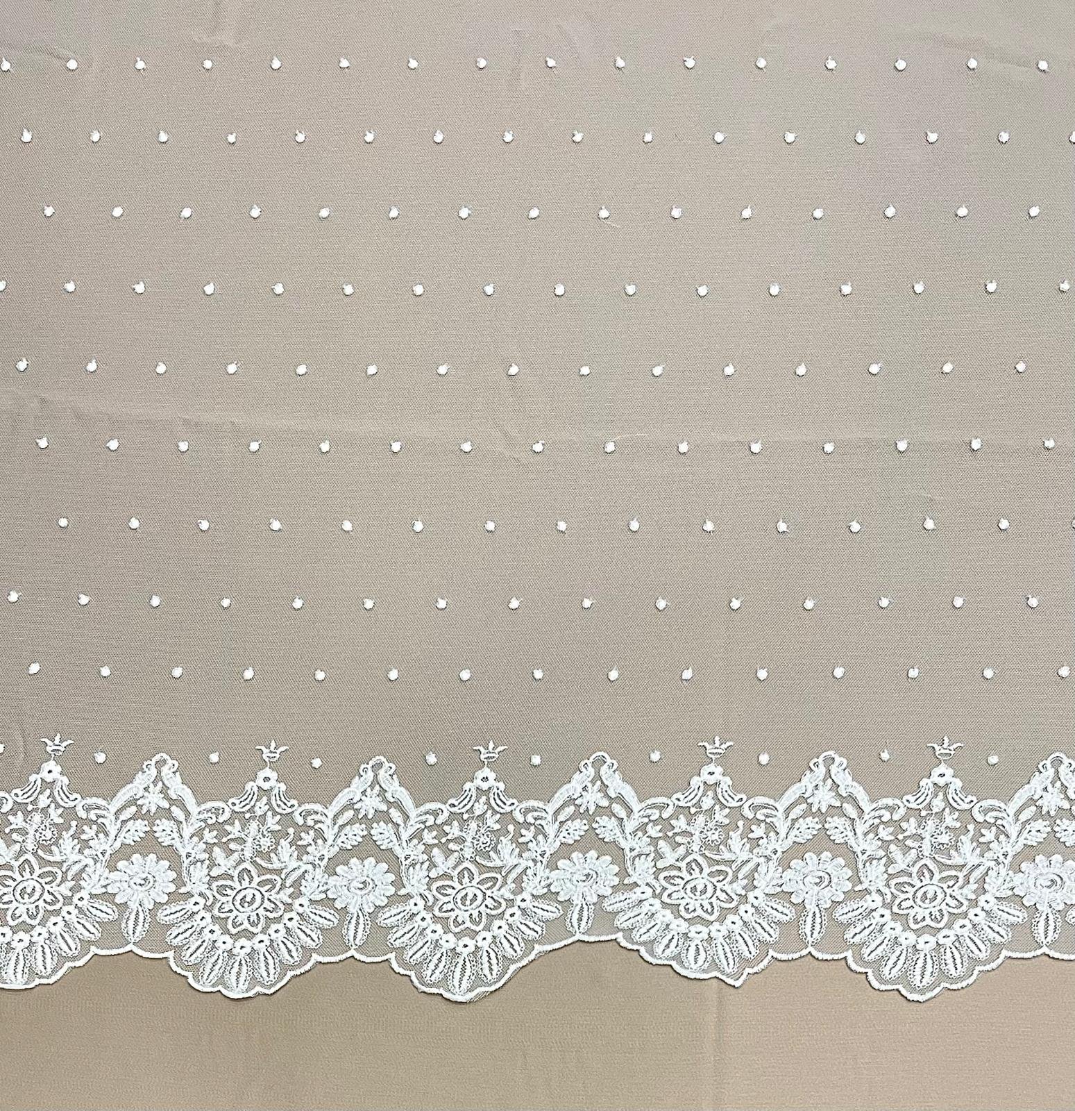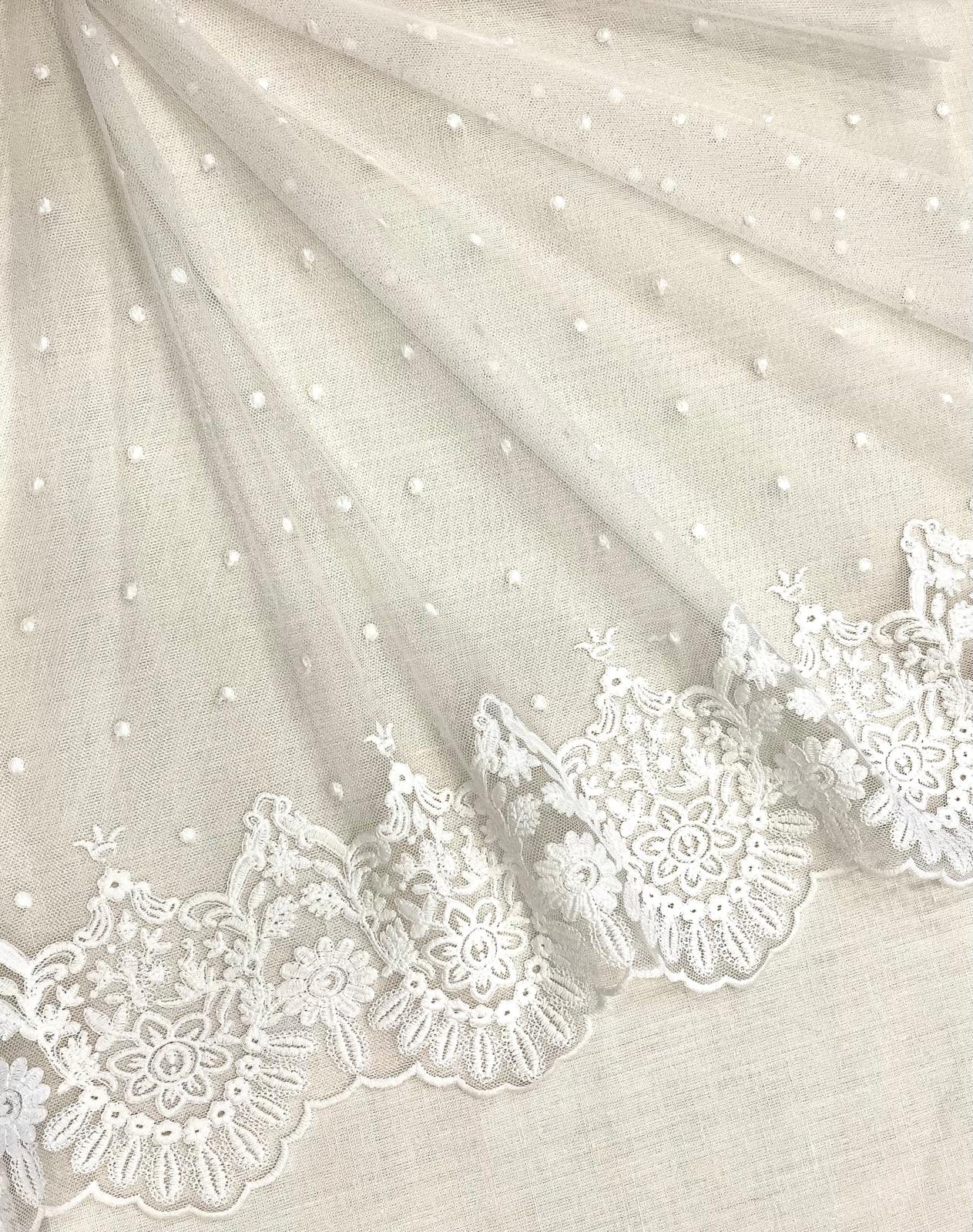 Tul bordado en tono blanco natural con plumeti y terminación en blonda con motivos florales. Blonda efecto espejo en ambos orillos del tejido.